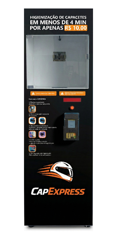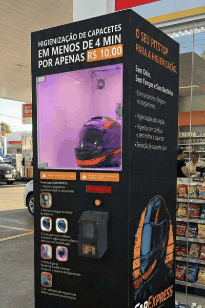 Higienização automática de capacetes em menos de 4 minutos com tecnologia segura e operação simples.